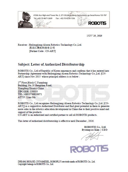 韩国Robotis官方对奥松机器人企业资质、行业地位、业务能力、技术条件以及售后服务等多方面经过数月考核,通过认证,并授予奥松机器...