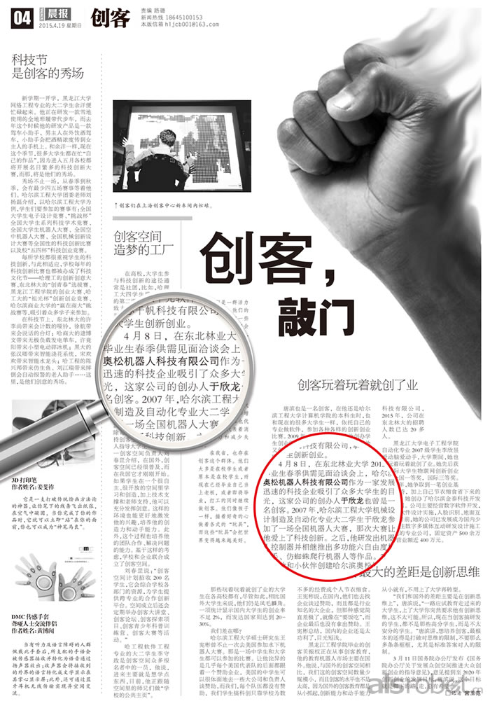 【媒体奥松】奥松机器人荣登黑龙江晨报《创客,敲门》系列报道